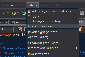 Netbeans besitzt eine eigene Konsole die man schnell aufrufen kann. Unter Dateien (Bild 1) wählt man einen Pfad und anschließend unter „Extras“ -> „Open in Terminal„.